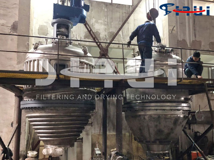 筒錐式反應(yīng)過(guò)濾干燥三合一是在同一密閉空間內(nèi),通過(guò)夾套控制溫度而進(jìn)行物料的加壓或真空反應(yīng)。反應(yīng)結(jié)束,對(duì)物料加熱真空濃縮后,降溫結(jié)晶析出反應(yīng)產(chǎn)物;啟動(dòng)攪拌主軸,使下錐體過(guò)濾板對(duì)結(jié)晶后的固液混合物進(jìn)行加壓或真空處理,利用濾餅兩端的壓差以及攪拌螺帶壓榨的擠壓作用進(jìn)行固液分離;通入洗滌液,使濾餅中的反應(yīng)液進(jìn)一步脫出并清除雜質(zhì),固液分離過(guò)程結(jié)束可得到較干的固相物;啟動(dòng)內(nèi)加熱螺帶,對(duì)物料加溫真空干燥zui終得到達(dá)到一定干度的產(chǎn)品。