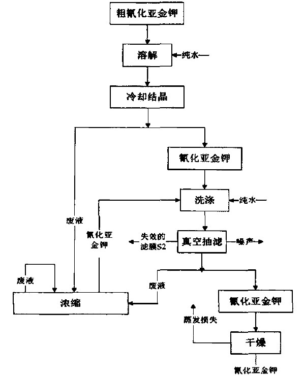 (1) 工藝流程過(guò)多,增加了控制難度。在金鹽生產(chǎn)中一次結(jié)晶出的金鹽純度無(wú)法達(dá)到優(yōu)質(zhì)金鹽所要求的質(zhì)量分?jǐn)?shù),要提高金鹽的產(chǎn)品質(zhì)量,就必須進(jìn)行重結(jié)晶。