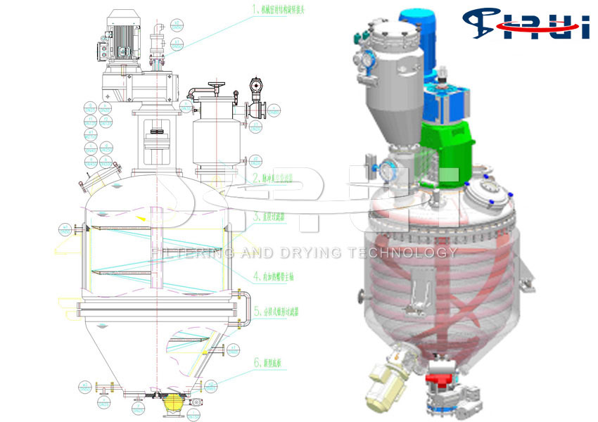 (6) 可用于反應(yīng)、過(guò)濾、干燥三種操作,使三個(gè)單元設(shè)備的作用在這一臺(tái)設(shè)備上完成,從而使設(shè)備成本、占地面積、勞動(dòng)強(qiáng)度、能耗等都大大降低。