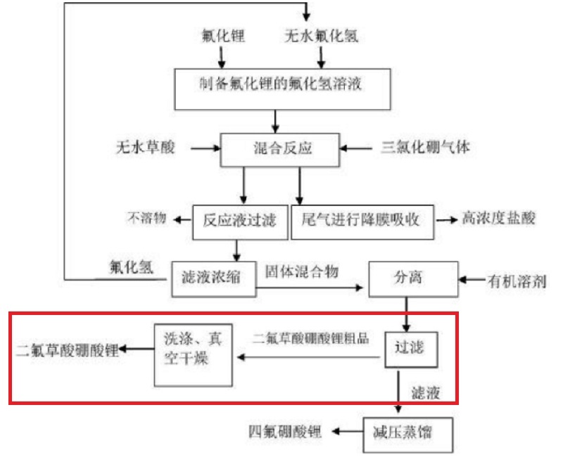 現(xiàn)有技術(shù)中多采用四氟硼酸鋰和無水草酸在有機溶劑(如碳酸二甲酯等)中反應(yīng)來制備二氟草酸硼酸鋰,在制備過程中需大量使用有機溶劑。而有機溶劑具有強烈的刺激性和強烈腐蝕性,遇明火燃燒,給工作人員健康和生產(chǎn)環(huán)境帶來危害,對設(shè)備的耐蝕性能也有較高的要求,投資成本大,不利于工業(yè)化。同時,由于四氟硼酸鋰和無水草酸在有機溶劑中反應(yīng)若生成二氟草酸硼酸鋰和氫氟酸,屬于弱酸制強酸,反應(yīng)是不可能進行的,因此常需要加入催化劑或反應(yīng)助劑。但是催化劑的使用容易向二氟草酸硼酸鋰中引入雜質(zhì),得到的二氟草酸硼酸鋰的純度較低,不能滿足鋰離子電池電解液用原料需求。