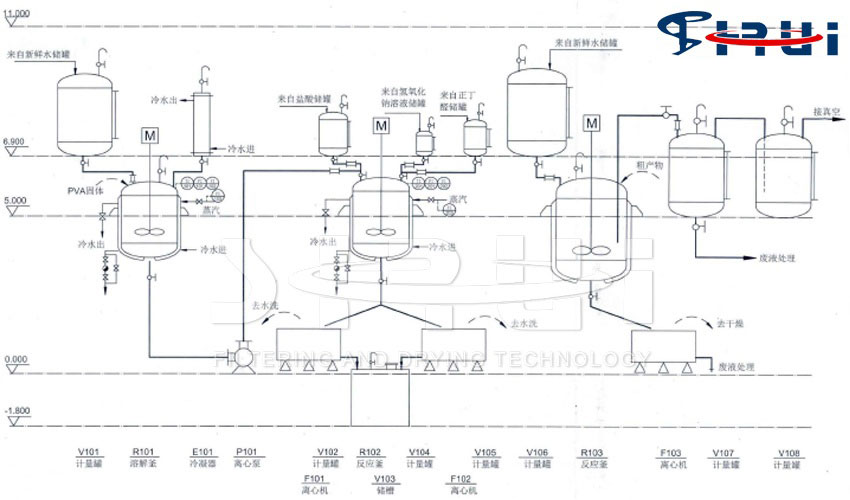 原有年產(chǎn)2000噸PVB樹脂合成車間生產(chǎn)工藝如圖所示,將PVA在溶解釜R101中加水升溫溶解后,用泵P101輸送至縮合釜R102,縮合、中和反應(yīng)在同一只釜R102中完成,由離心機(jī)F101、F102過(guò)濾后的粗濾餅,經(jīng)操作工用推車送至洗滌釜R103中洗滌,通真空抽干再加去離子水洗滌,然后抽干,按此重復(fù)進(jìn)行,共洗滌八次,zui后一次洗滌后,直接讓固液混合物從出料口流出至離心機(jī)F103中離心過(guò)濾,再送至干燥車間,得到PVB產(chǎn)品。現(xiàn)有PVB樹脂洗滌工藝存在的問(wèn)題:增加水洗釜每次水洗廢水的排放量,可相應(yīng)減少水洗次數(shù),減少用水量,這是PVB生產(chǎn)廠家的共識(shí),部分廠家采用對(duì)水洗釜抽真空的方式,盡量將廢水排盡。采用水洗和離心脫水多次循環(huán)的方式,亦可達(dá)到上述目的,具體操作方式為將水洗過(guò)的PVB樹脂放入離心機(jī),脫水后再放入水洗釜水洗,如此循環(huán)。但采用該法勞動(dòng)強(qiáng)度較大,要將物料不斷在離心機(jī)和水洗釜間倒換。