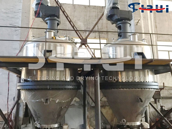 目前精細(xì)化工行業(yè)中廣泛應(yīng)用的過(guò)濾洗滌二合一裝置,由于其內(nèi)部都是采用平板式燒結(jié)網(wǎng)過(guò)濾,通過(guò)內(nèi)部攪拌器的升降和旋轉(zhuǎn)的雙重作用,將內(nèi)部固體殘留物排出機(jī)外,但常規(guī)的裝置不僅過(guò)濾效果不佳、還極易出現(xiàn)濾液滲漏,且使用者的洗滌的麻煩,并不利于使用者進(jìn)行多次操作。而且常規(guī)的過(guò)濾洗滌二合一往往無(wú)法快速的將濾液排出,且還不便于操作者對(duì)裝置清理完全,還容易出現(xiàn)濾液滲漏浪費(fèi)的情況。無(wú)錫雙瑞研發(fā)的高效筒錐式過(guò)濾洗滌二合一,頂蓋、筒體及錐球型殼體通過(guò)法蘭相互連接形成封閉的容器,攪拌驅(qū)動(dòng)裝置帶動(dòng)中心軸及環(huán)繞中心軸的螺旋攪拌裝置進(jìn)行旋轉(zhuǎn),帶動(dòng)物料實(shí)現(xiàn)攪拌作業(yè);在容器外側(cè)壁的過(guò)濾裝置能夠?qū)ξ锪线M(jìn)行過(guò)濾,濾液穿過(guò)過(guò)濾裝置被濾液收集板收集,并通過(guò)濾液出口排出筒體。容器底部的錐球型殼體配合與錐球型殼體的球面結(jié)構(gòu)內(nèi)表面貼合的底攪拌裝置,可使得容器內(nèi)的物料不存在操作死角,使得攪拌更均勻,且不會(huì)造成物料的浪費(fèi)。