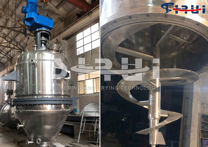 筒錐式過(guò)濾洗滌二合一的錐體或筒體內(nèi)設(shè)置有多層孔板及過(guò)濾介質(zhì)疊合而成過(guò)濾裝置,內(nèi)部設(shè)置有攪拌軸和變角度變導(dǎo)程螺旋攪拌裝置,在過(guò)濾時(shí)對(duì)物料進(jìn)行攪拌、提升和刮料操作,在卸料時(shí)自動(dòng)推出濾餅。本機(jī)可進(jìn)行真空過(guò)濾或加壓過(guò)濾。在過(guò)濾過(guò)程中,機(jī)內(nèi)刮刀不斷把濾網(wǎng)上的濾餅刮下,使物料在薄層濾餅條件下進(jìn)行過(guò)濾,過(guò)濾速率很高。低分子量聚四氟乙烯樹(shù)脂無(wú)機(jī)酸中和工藝可先將料漿在機(jī)內(nèi)濾干,然后加入洗滌液,利用機(jī)內(nèi)刮刀、攪拌器及擠壓螺旋等的旋轉(zhuǎn)攪拌,使濾餅再漿,這時(shí)再通過(guò)加壓或抽真空的方法把再漿料過(guò)濾成濾餅。這樣反復(fù)多次再漿過(guò)濾,可把物料徹底進(jìn)行洗滌,zui終再把濾餅全部擠出機(jī)外。