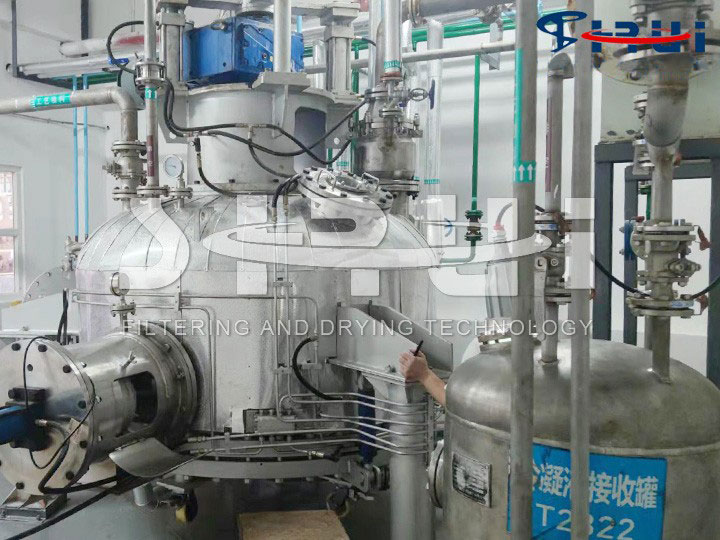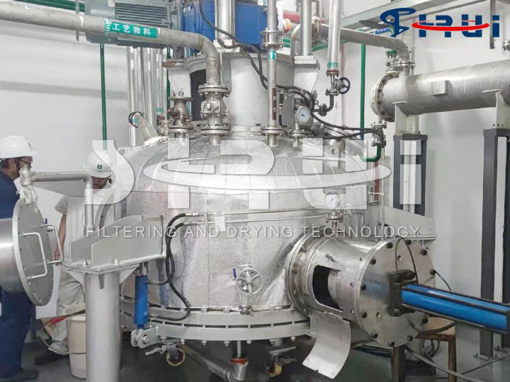 ??在醫(yī)藥、農(nóng)藥、炸藥、染料、顏料及其它精細(xì)化工生產(chǎn)過程的后處理工序中,常有過濾、洗滌、干燥等單元操作,這些單元操作通常由離心過濾機、洗滌槽以及干燥機等單元設(shè)備單獨運作,設(shè)備間通過管道或采用其它方式輸送物料。多種單元設(shè)備連成一個系統(tǒng)的大裝置、長流程、低效率、難調(diào)節(jié)的生產(chǎn)過程,對于固體含量較高的懸濁液,往往發(fā)生固體粘壁而堵塞管道,造成生產(chǎn)難以正常進行。采取敞開式生產(chǎn),雖便于處理堵塞問題,但對于醫(yī)藥、 食品、生物制品等難以滿足規(guī)范要求,而且對于易燃、易爆、有毒或劇毒的物料,還存在安全隱患。