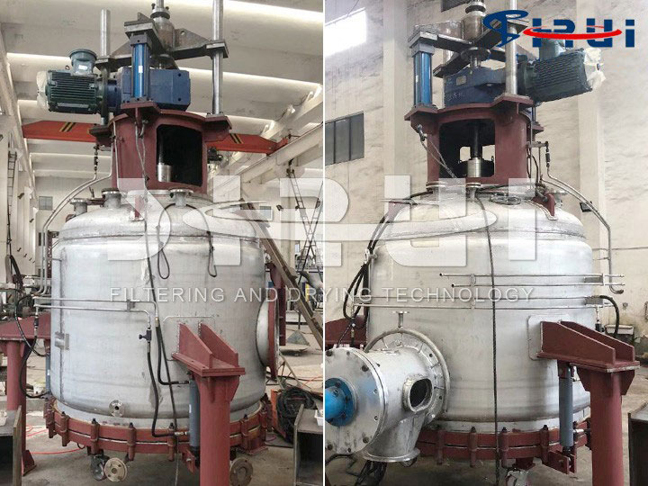 ??過濾工藝完成后,需要進行下一步工藝操作,即洗滌。三合一設(shè)備罐內(nèi)裝有特制的噴淋裝置,可使清洗(洗滌)液均勻分布于罐內(nèi),通過開啟攪拌系統(tǒng)、攪拌升降機構(gòu)、傳動機構(gòu),可使槳葉進行旋轉(zhuǎn)運動和上下軸向運動,使物料得到充分的洗滌,將晶粒表面粘附的雜質(zhì)洗滌干凈。洗滌所用的洗滌液和洗滌次數(shù)需按物料、生產(chǎn)工藝特點而確定。