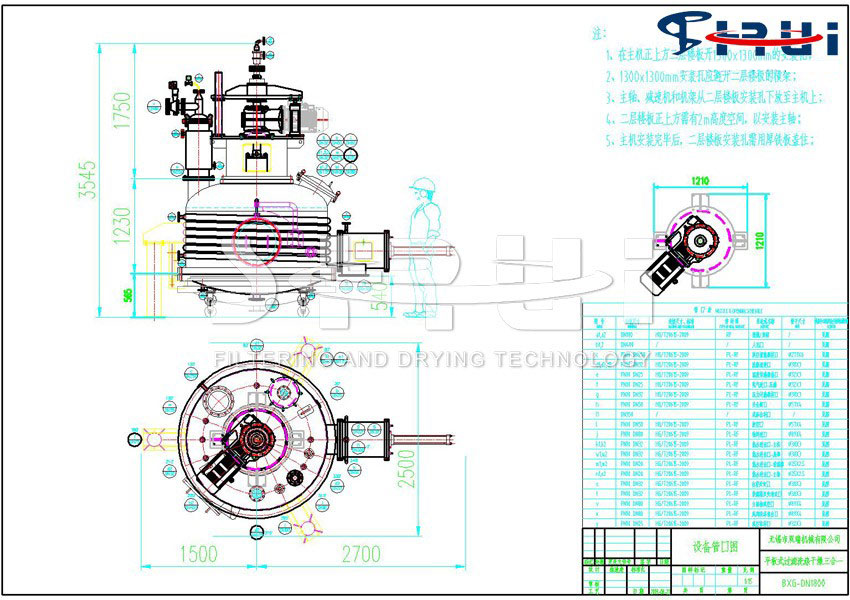 ??過濾洗滌干燥機(業(yè)內(nèi)俗稱“三合一”)能實現(xiàn)物料的過濾、洗滌、干燥、滅菌、卸料等連續(xù)工藝過程,其操作方式屬于分批式操作(間歇操作),廣泛應(yīng)用于制藥、食品、農(nóng)藥、化工等領(lǐng)域。過濾洗滌干燥機主要由承壓部分的立式罐體、加熱系統(tǒng)、攪拌系統(tǒng)(攪拌軸、攪拌槳、機械密封等)、攪拌升降機構(gòu)、傳動機構(gòu)、過濾介質(zhì)、出料閥、噴淋裝置、滅菌裝置、液壓泵站、主電控柜(包括變頻器、PLC)等部件組成,實現(xiàn)了機、電、儀一體化。