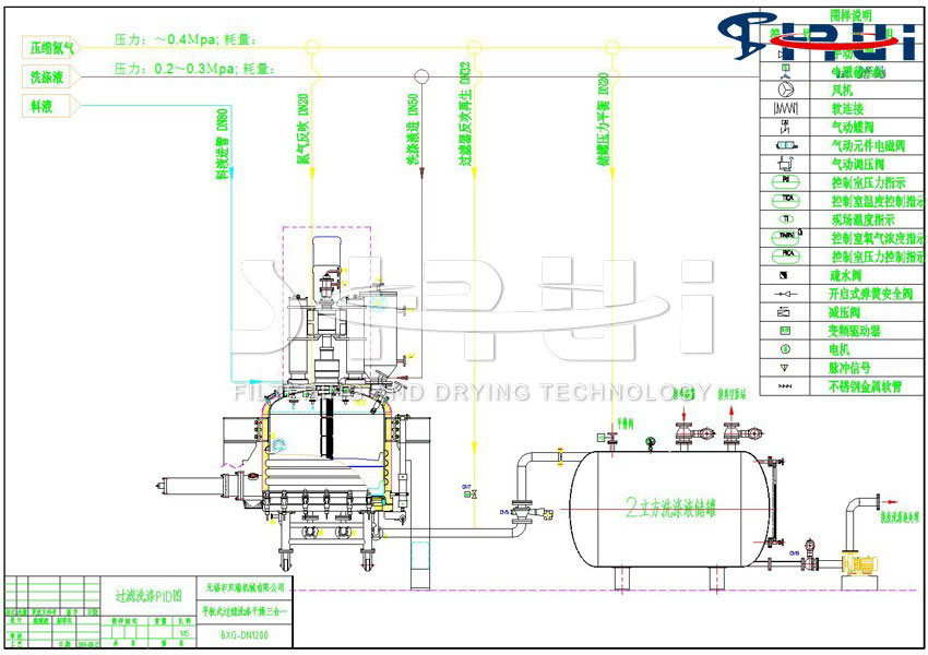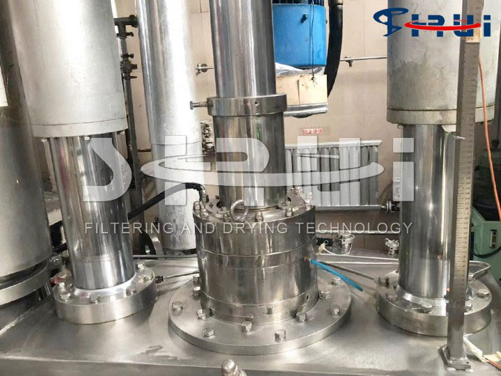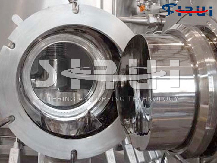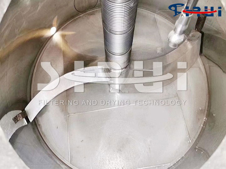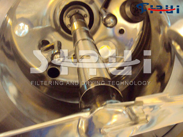 ??(4) 洗滌:在容器內側裝有萬向清洗球,使清洗液均勻分布于容器內,用以進行物料清洗及容器清洗,通過升降攪拌漿葉的攪拌將濾餅和清洗液混合,使?jié){狀懸濁液濾餅充分洗滌;
