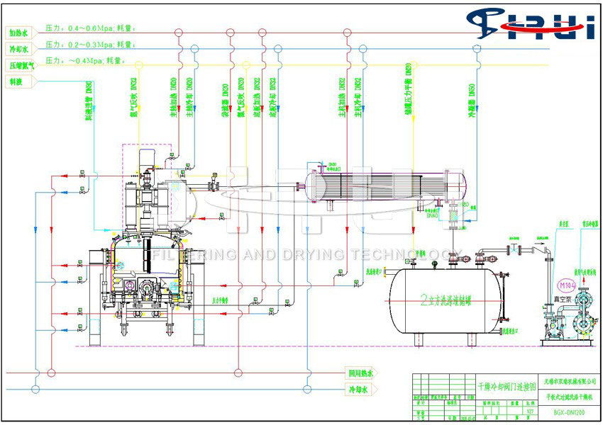 ??無菌級過濾洗滌干燥機主機由罐體、底盤、驅動裝置、攪拌裝置、加熱裝置、側面卸料閥、支座等組成。