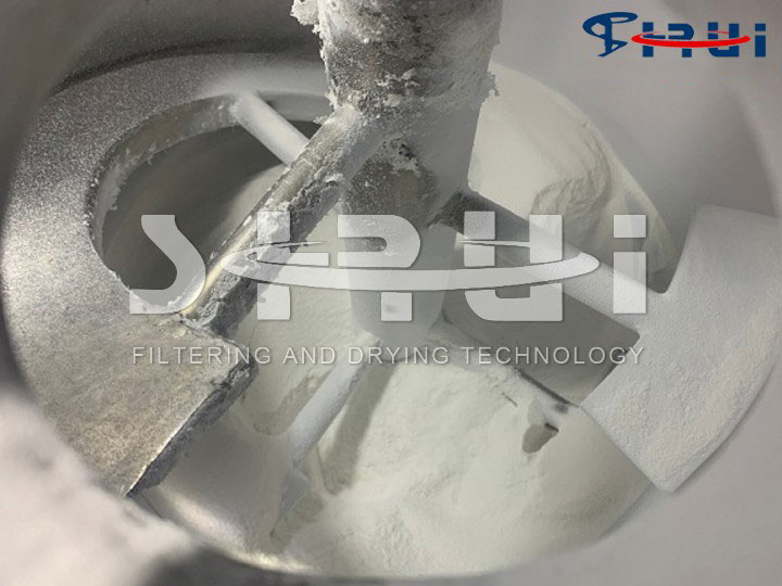 ??在反應階段,反應物料從頂部加入,獨特的攪拌結構可使物料在機內得到均勻的攪拌,并通過筒體夾套、錐體夾套及空心軸、空心螺旋葉的同時加熱或冷卻,使物料在機內充分反應。在過濾階段,本機可使物料在機內通過加壓或抽真空過濾濾干,并加入洗滌液,使物料在機內進行多次自動再漿洗滌,達到洗滌要求后再壓干。在干燥階段,筒體夾套、錐體夾套、空心軸、空心螺帶同時對物料進行加熱并在頂部抽真空,對物料進行真空密閉低溫干燥,干燥后自動密閉出料。